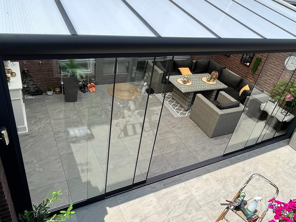 De combinatie van hoogwaardig aluminium en glas zorgt voor een luxe uitstraling. De schuifwanden bestaan uit meerdere schuifbare glazen panelen met minimale overlap, die door handige deurmeenemers in één beweging zijn te openen of sluiten. Je kunt glazen schuifwanden plaatsen, onder iedere type overkappingen.
